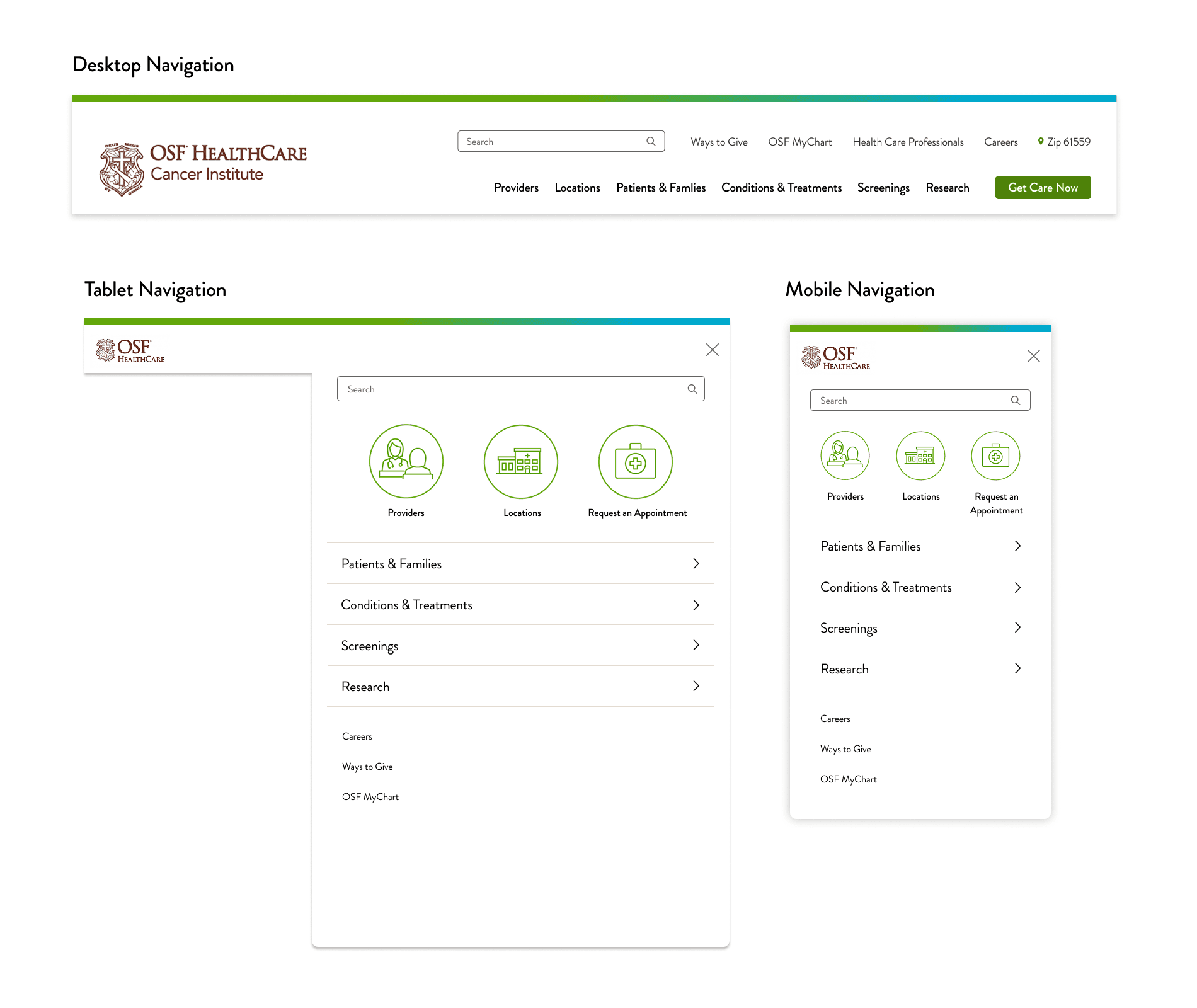 Our goal was to create a digital experience that mirrors the excellence of care delivered by OSF Mission Partners. Stakeholder input, web analytics, and industry best practices uncovered key challenges: confusing navigation, a homepage that lacked emotional impact, and messaging that didn’t adequately convey the Institute’s advanced offerings or the compassionate mission of OSF. Through a user-centered design (UCD) approach, we focused on addressing the real needs of individuals visiting the site—often during some of the most overwhelming moments of their lives.